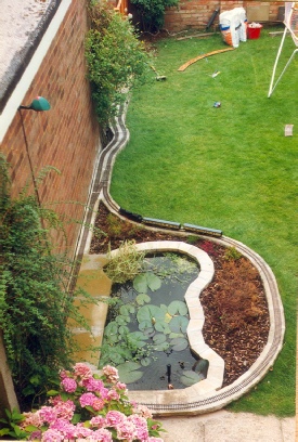 We have always had some interest in railways, visiting restored lines when out and about around the country and collecting a selection of toy trains with our sons when they were small. Our small garden was first transformed, in 1993, by a wooden track base around two sides. Eventually this was improved with the addition of a dwarf wall along two sides, wide enough to take two 0 gauge tracks side by side. Over the next few years the track grew to circle the fish pond at one end and the vegetable patch at the other. A collection of rolling stock was purchased including a Meths powered steam engine and various electric engines.
