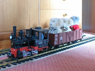 To begin with, a short length of track was laid on the floor in the lounge running from sideboard to TV and back. Around this time, one of us decided, for a joke, that some of our collection of small 8” Russ Bears would fit nicely in the trucks as passengers, despite not really being to scale! Thus began the Teddy Bear Line.