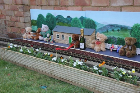 The “Opening Ceremony” for the first section of the line was held in September 2013. A ribbon was cut, beside a suitably sized bottle of champagne, and Karen pulled the train along the line to the accompanying cheers from our invited guests (like minded friends and family). We even made a short video of the proceedings. See the video page