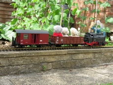 During this time, we added to the rolling stock. We purchased locomotives. We wanted trucks for the “furry passengers” as well as coaches to match the scale. The “passengers” may not be the right size but they certainly make people smile.